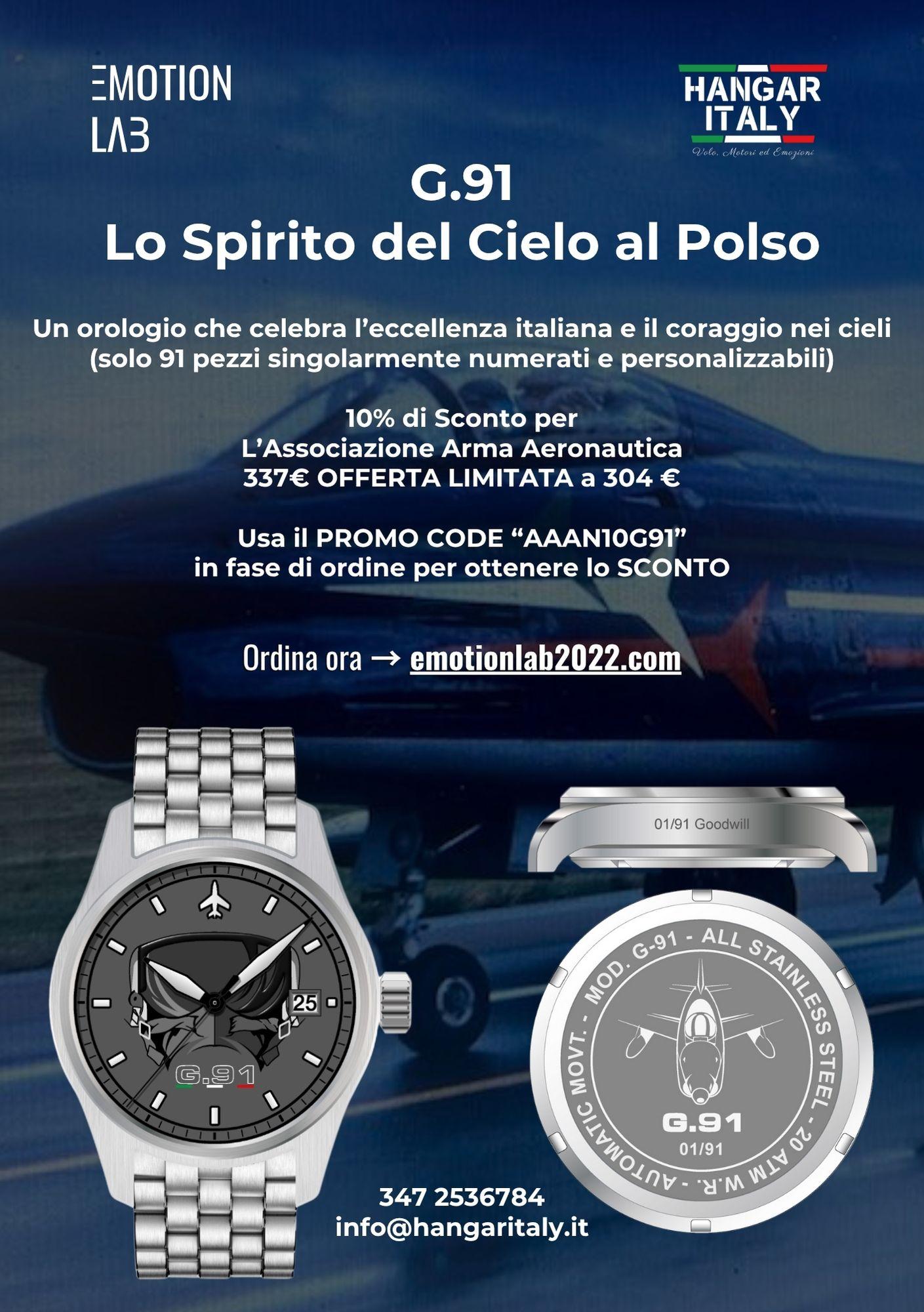 Su richiesta della Presidenza Nazionale si allega la locandina promozionale con cui le ditte Emotion Lab e Hangar Italy offrono un codice sconto ai soci AAA per l’acquisto dell’orologio “G91”.